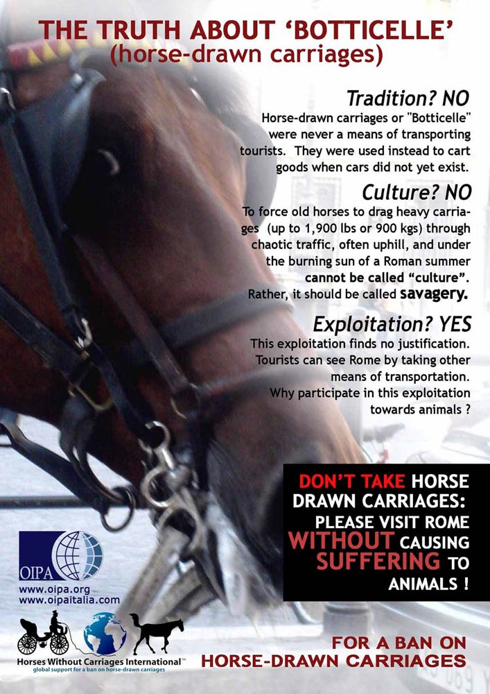 The new regulations were adopted after a series of accidents over the past few years, which have seen horses maimed in the line of duty. In addition to limiting the horse's work-day to a maximum of eight hours with mandatory breaks during the hottest hours of the day, the city ordinance mandates regular check-ups by city-approved veterinarians. Carriage drivers will also be required to display license plates, that can be used to report mistreatment of the animals. However, the buggies will continue to operate on the heavily trafficked streets of the historic center, one of the main bones of contention between the drivers and animal rights' activists. While city officials said the measure marked a clean compromise, the head of one of Italy's leading animal rights groups, Animalist Italiani, said he wasn't satisfied. "We're not going to stop lobbying until we get them off the streets for good," said Walter Coporale. "It simply isn't conceivable for horses to be carting people around in 2010," he said. Coporale said the city ought to have limited the carriages to shady park trails or helped buggy drivers replace them with electric-powered vintage cars. Both ideas have been discussed by the city council, but neither one found much appeal among the carriage drivers. Failing that, he said "the important thing is to make sure horses are protected by same legal status that dogs and cats have". At present, horses are classified under Italian law as livestock, which puts them in the same category of animal treatment as sheep and cattle. The buggy drivers, however, have argued that they treat their animals "like family" and rejected the notion that their time-honored line of work was necessarily inhumane. The dispute over tourist buggies came to a head after a pair of accidents in 2008, which saw two horses seriously injured on the job. That summer, a horse collapsed from exhaustion on Rome's glamorous Via Veneto while hauling a carriage uphill under the sweltering summer sun. Then in the fall, a horse had to be put to sleep before a crowd of horrified onlookers after it slipped near the Colosseum and broke its leg. As a first response to the outcry over the accidents, the city council last July set up a emergency veterinary response team for injured cart horses. The service consists of an on-call veterinarian and horse ambulance capable of transporting the animal to the ''emergency room'' at an equine clinic run by the Italian mounted police. FACT: Not many tourists are aware the Roman horse-drawn carriages (called "Botticelle") are not a tradition of public transportation. In fact, the "Botticelli" owe their name to "barrels": the carriage pulled by animals in the 1800’s was used solely for transporting goods, or barrels in this case. So, there was never a "tradition" of tourist transportation as misleadingly the jackass full of crap and immobile from liquor driving the carriage wants the tourist to believe. The carriage driver who has more food caught in his teeth than the horse eats the entire day is only interested in making the most profit from this activity and therefore does not care about the well-being of the animal. He also is not subject, like other workers (rat-bastard taxi drivers, son-of-a-bitch gondoliers) to any official price list, being able to make money at will and come to ask even $300 per trip, all while not paying taxes to the state as there are no price regulations or receipts. So, if you have to succumb to the desire of being driven around the Roman capital by carriage for an insufferable price, save the poor animal from its agony and kindly ask the driver to have it substituted with a couple of nauseating, repugnant, stinking, and obnoxious gladiators who stand all day in front of the Coliseum and berate you for that $10 photo pose with them.